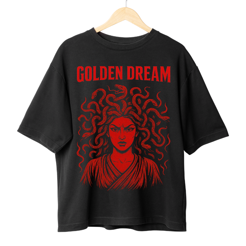 A Red Medusa representa a energia bruta de quem não segue padrões. É explosão, cor e movimento — a camiseta de quem transforma raiva em arte